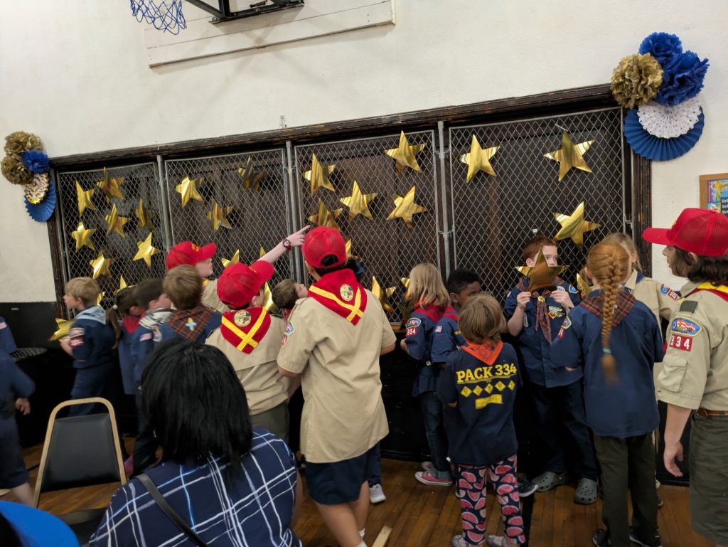 We award each Scout new rank badges, which they’ve been working on all year. Lions become Tigers, Tigers become Wolves, Wolves become Bears, Bears become Webelos, and Webelos become Arrows of Light. Their parents remove their old neckerchiefs and replace them with their new neckerchiefs.